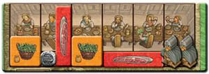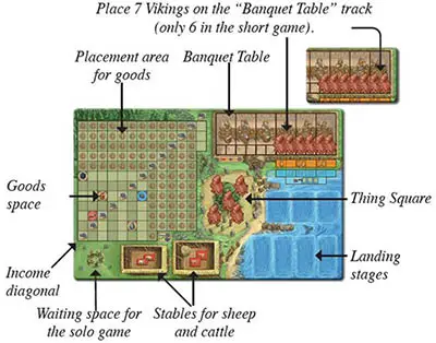 Place a Viking on each numbered space of the "Banquet Table" track (at the top right) of your home board and the rest on the "Thing Square" (the Vikings' meeting place). The latter are your starting Vikings. (Consequently, in the short game, you start the game with one more Viking).