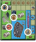 During the game, you will place green, blue goods tiles, ore tokens and silver coins on your home board. The smallest uncovered value on the "income diagonal" indicates the amount of silver you receive this phase.