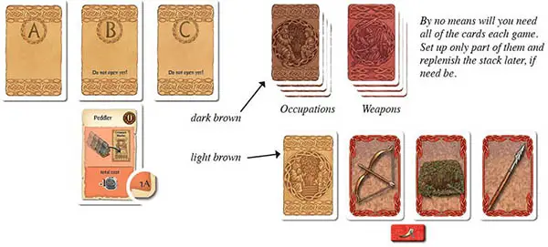 Shuffle the remaining weapon cards and place them face down in a stack on the table. Shuffle the occupation cards with a dark brown back and also place them face down in a stack on the table.