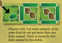 Lastly, any player with at least 2 animals of the same type receives exactly one additional (baby) animal of that type - but only if the lamb, the shoat (piglet) or the calf can be accommodated in the farmyard (or on an appropriate Improvement card, for example the "Animal Yard", "Wildlife Reserve" or "Forest Pasture").