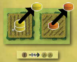 Place new goods and Food on any Action spaces on the board that require them (on the printed spaces as well as on Action and Round cards). These spaces are shown by an arrow.