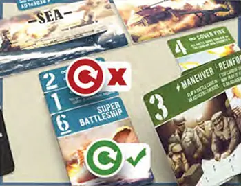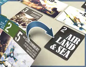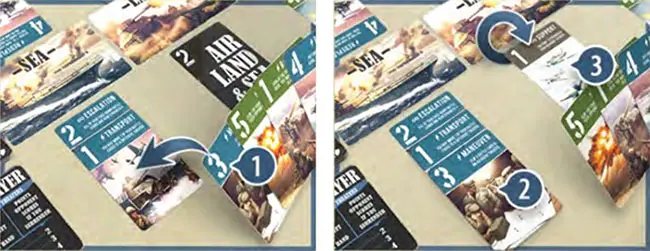Type: There are three types of Battle cards which are represented by color: Gray for Air, Green for Land, and Blue for Sea, which relate to the three Theaters. Normally, you may only play a Battle card face-up to its matching Theater: Air Battle cards in the Air Theater, and so on.