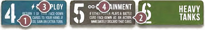 Tactical Abilities: Most Battle cards have a Tactical Ability 2 next to their Strength, which takes effect as soon as the Battle card is played face-up to a Theater. These abilities are either Instant 3 or Ongoing 4, which is explained in greater detail on page 7.
