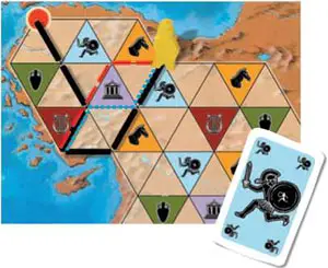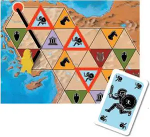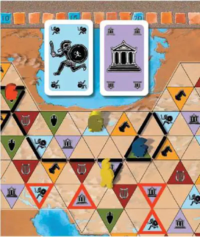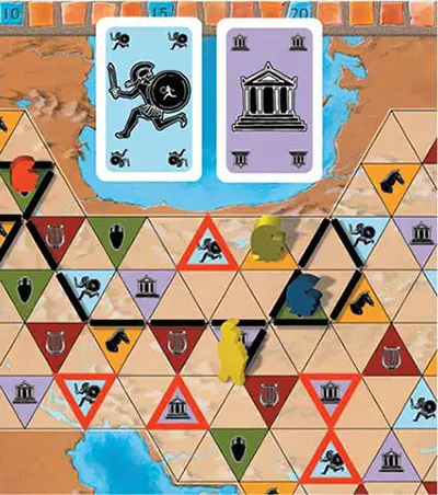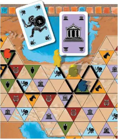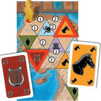 Then, he places 1 yellow guard on a lyre space and plays cards matching the other symbol spaces in the province: 2 temple cards, horse card, soldier card, and amphora card.