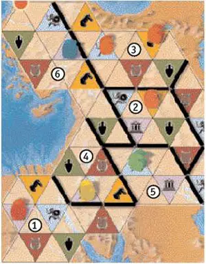 When a player moves Alexander, he should do so to try to create provinces with high open to symbol space ratios, so he can then occupy them. The more open spaces, the more valuable a province is and the fewer symbol spaces, the less it costs to occupy.
