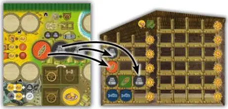 Coins are handled differently than goods and food tiles. First, coins are always spent and returned to the supply when used. Second, coins are kept next to your action board. This means that coins do not go into your bag or container , and you do not have to put them onto planning spaces to use them. (Remember: On market extensions, you do have to place the required coins during the planning phase in order to take the action during the actions phase).