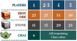 13 Fill the supply bag with the resources (Iron ore, Stone, and Chai) according to the Supply table (see below). Return any unused resource cubes to the game box, they will not be used in this game.
