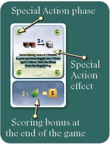 Smash Stone: Pay 1 Stone cube into the Supply bag and take 2 Rubble cubes from the general supply into your personal supply.