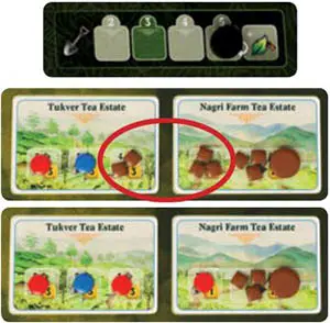 Red has 4 Tea Estates and gains 2 Tea Leaves. Then move the marker to the starting space.