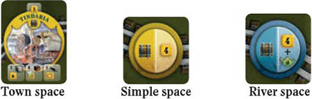 If you build on a River space (blue circle), gain 1 Chai as a bonus (record this on the Chai track). Now players can build Station spaces in any towns before the next available River space (see Build a Station Space).