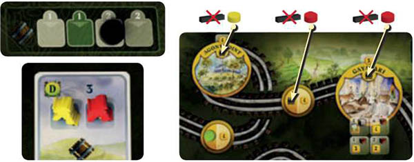 For each Steel bar returned, place one of your Ownership markers on the next available Track space on the railway, starting from the space between Siliguri Town and Sukna (crossing the river) and moving 'up' the mountain towards Darjeeling.