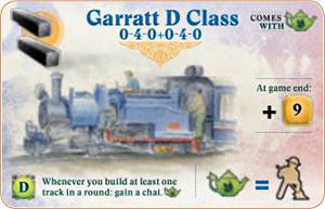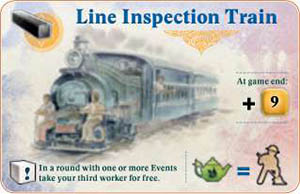The first time you lay one or more tracks in a Round, gain 1 Chai; you may use it with any other Workers you have yet to resolve in action spaces, including space D.