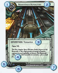 The Corporation pays credits equal to the play cost 1 of an operation to play it. When played, an operation's abilities as listed in its text box 4 are resolved. Then, the operation is immediately trashed. Operations are never installed.