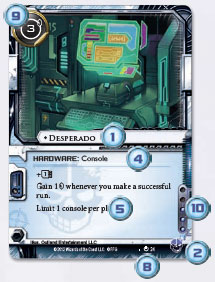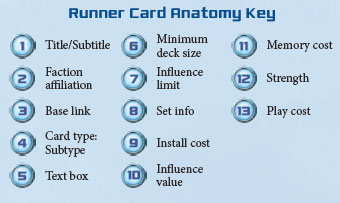 The Runner identity card defines the Runner's faction and describes the identity's special ability. It also provides a minimum deck size that must be observed when constructing a deck 6, and the amount of influence available for spending on out-of-faction cards 7. See "Deckbuilding" on page 24 for more information.