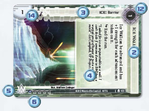 A piece of ice has one or more subroutines | in its text box 4 that the Runner must break during a run or suffer their effects (see "Ice" on page 16) if the ice is rezzed.