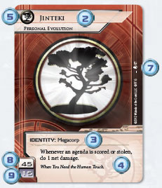 The Corporation identity card defines the Corporation's faction and describes the identity's special ability. It also provides a minimum deck size that must be observed when deckbuilding 8 and the amount of influence available for spending on outof-faction cards 9.