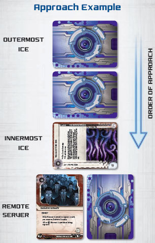The Confrontation phase consists of approaching a piece of ice and then potentially encountering that ice. A Runner approaches each piece of ice protecting the server one at a time, starting with the outermost piece. The Runner must pass each piece of ice in order to approach the next piece of ice protecting the server, continuing until all pieces of ice have been passed or until the run ends. If the Runner passes all pieces of ice protecting the attacked server, the run proceeds to the Access phase.