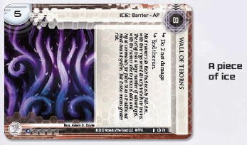 Ice is defensive software the Corporation installs in front of his servers to protect his valuable data. There are four main subtypes that can appear on a piece of ice: sentry, barrier, code gate, and trap. Ice also has separate abilities called subroutines.