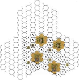 A player who has San Giorgio as his patron saint wins if he has enclosed the entire zone of control of another player within his own zone of control. That is, if he can reach every hex which the other player can reach (figure 8). He need not be able to reach the hexes which contain the inns and cities ol the other player, just the hexes that can be reached from these inns and cities.