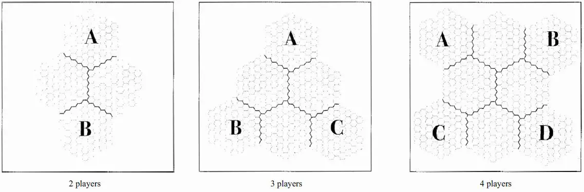 Lay out the map by randomly picking two map tiles per player, and placing them in the appropriate configuration shown above. Every player then places his starting city on a different "comer" map tile, as indicated in the figure.