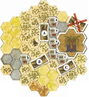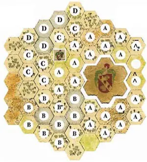 If the player builds an inn on the indicated place, the areas marked "C" (or "C" and "D" if he has a manned harbor) are added to his zone of control.