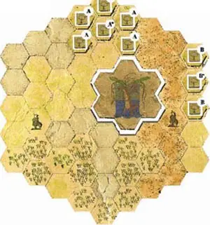 Cart Shops can build cities. A manned Cart Shop can also be used to build a new city (see figure 6). A city must be built completely on land (no sea). Some or all of the land may be polluted (discard the pollution markers in this case). A city may not be built directly adjacent to another city. At least one of the new cities' hexes has to be within the zone of control of the player building it.