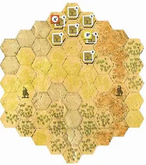 The Lyon player has manned his stables and therefore has a zone of control extending 3 steps. The Otter player has been encircled by the inns of the Lyon player: the Lyon player can reach ever}- hex the Otter player can reach.