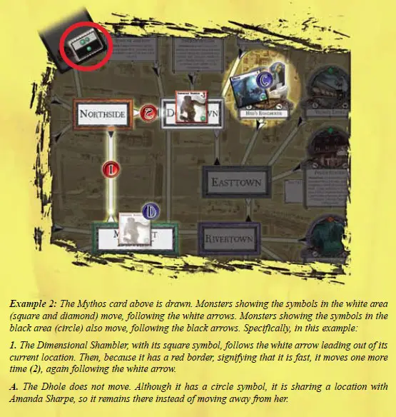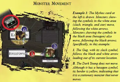 In order to determine monster movement, the first player looks at the lower-right corner of the Mythos card he has drawn for the turn. This area describes which monsters move during the turn as well as the direction they move on the board.