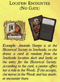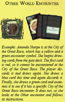 Once the player has drawn a gate card that matches an encounter symbol's color, he examines it to see if there is a specific encounter for the Other World his investigator is currently in.