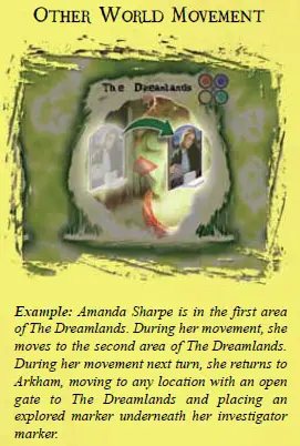 If an investigator is in an Other World at the beginning of the Movement Phase, he receives no movement points. Instead, his movement depends on whether he is in the first (left) or second (right) area of the Other World.