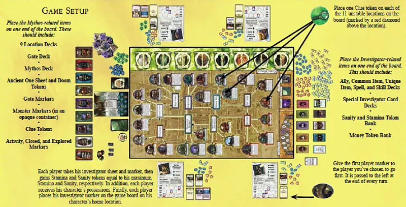 Separate the various investigator and Ancient One cards into their respective decks and place them near the board as shown in the setup diagram.