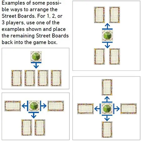 Examples of some possible ways to arrange the Street Boards. For 1, 2, or 3 players, use one of the examples shown and place the remaining Street Boards back into the game box.