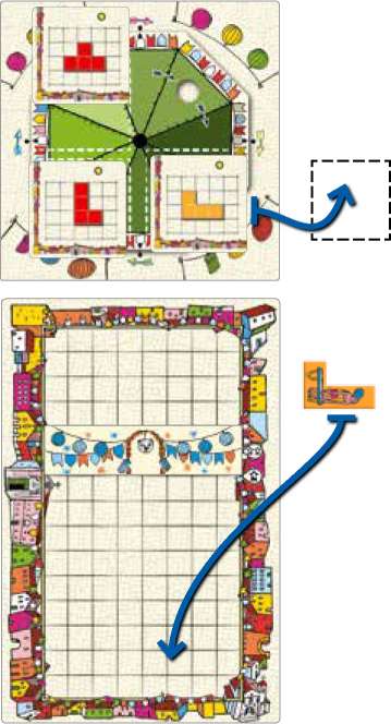 To place a Color Piece, select any card on the octagon. Place the piece shown on that card onto your Street Board, then discard the card.