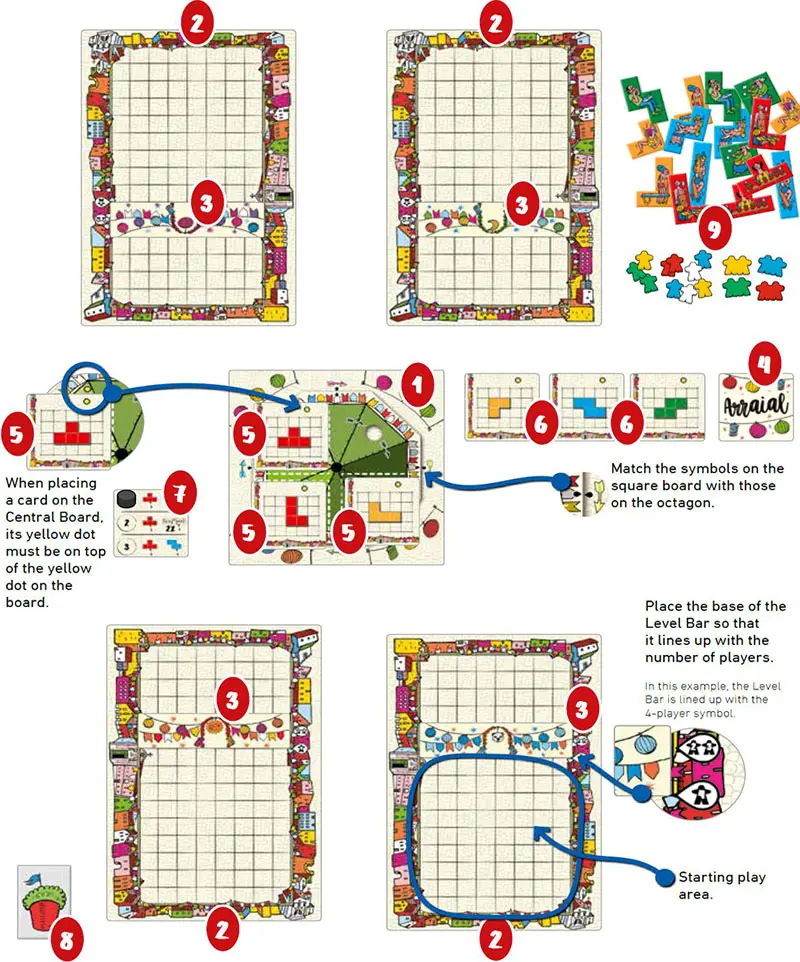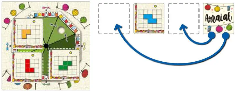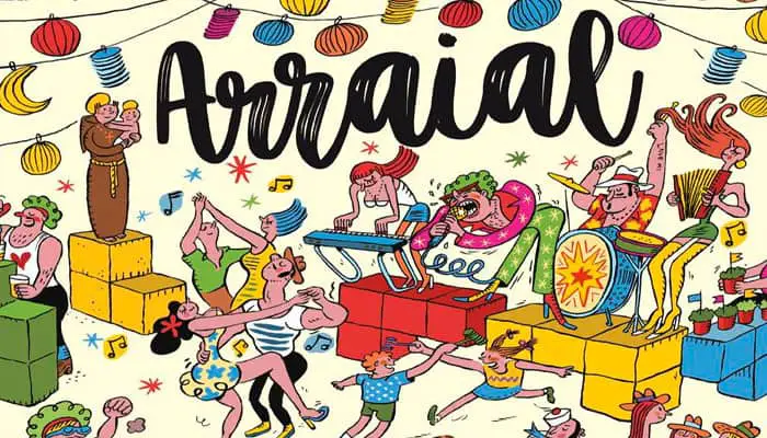 Each neighborhood, and even each street, hosts its own Arraial, where friends and neighbors join to enjoy music, food, and drink. In Arraial, players organize their own festivals. Whoever attracts the greatest number of visitors will win the game!