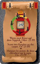 Should the player have fewer than two Knights on the six carpet spaces, he can still play this card, receiving -25 points for it instead (and ignoring the positions of his Knights).