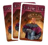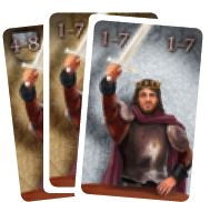 The player who plays this card must choose one of his Knights on a green (1 to 10) space, one on a yellow (3x 0) space and one on a red (-1 to -15) space and score all three, moving his scoring marker forwards or backwards the corresponding amount.
