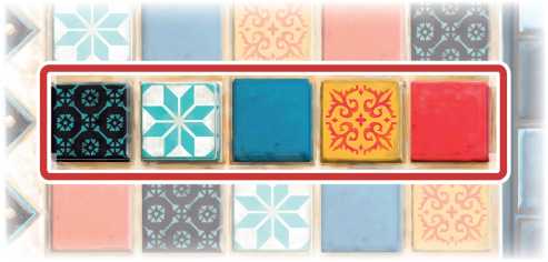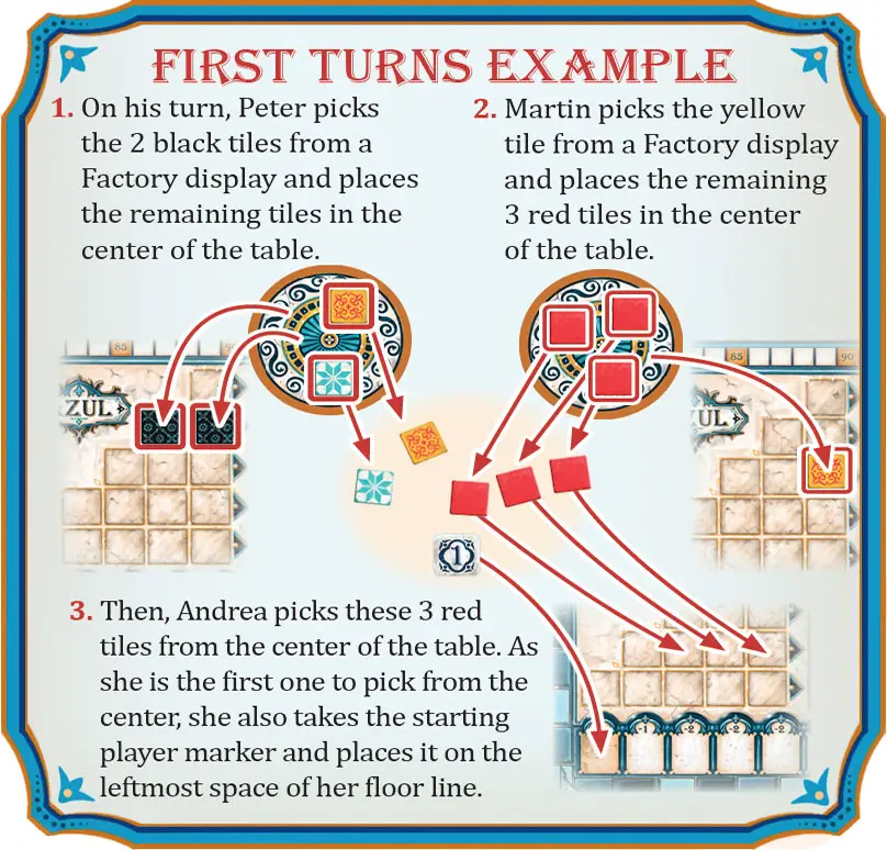 Or: Pick all tiles of the same color from the center of the table. If you are the first player in this round to pick tiles from the center of the table, also take the starting player marker and place it onto the leftmost free space of your floor line.