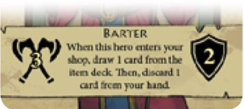 Once all shops are occupied, you can sell item cards from your hand to the hero in your shop. You can sell any number of items to a hero so long as the item card has an icon that corresponds to the hero's class.