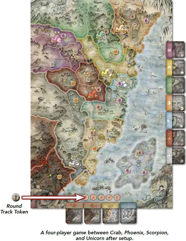 Place Starting Control Tokens: Beginning with the first player and proceeding clockwise, each player places one of their set-aside control tokens facedown in the center of any province that does not already contain a control token.