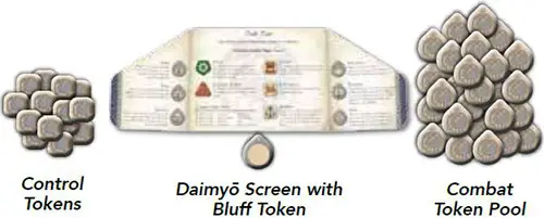 Then, each player takes their bluff token and places it behind their daimyo screen. Finally, players flip their remaining combat tokens facedown and mix them to create a randomized combat token pool.