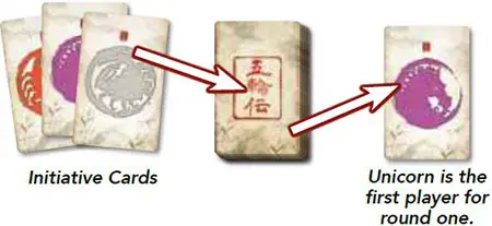 Determine First Player: Shuffle the initiative card of each clan chosen for this game to create the initiative deck. Then, reveal the top card from the deck; the clan that corresponds to the revealed card is the first player.