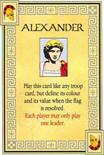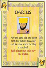 Leader (Alexander, Darius): The Leaders are wild cards. Play a Leader like any Troop card, but define the color and value when the Flag is resolved. For example, you have a Blue 8 in your layout.