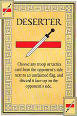 Deserter: The player may choose any one Troop or Tactics card from the opponent's side next to an unclaimed Flag, and discards it face up on the opponent's side next to the Tactics card deck. Do not cover any other discard.