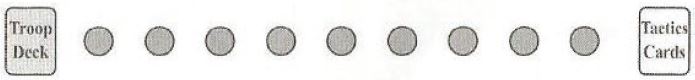 Place the remaining Troop cards as a facedown deck at one end of the battle line. Shuffle the ten Tactics cards and place them as a facedown deck at the other end of the battle line.