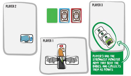 The player with the strongest Monster Army that can beat the Babies wins the battle and collects the Babies as points.