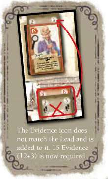Choose one of the unconfirmed Leads and play an Evidence Card from your hand below that Lead. When playing an Evidence card to a Lead, your goal is to match the Lead's icon and reach that Lead's value.