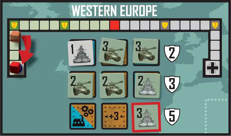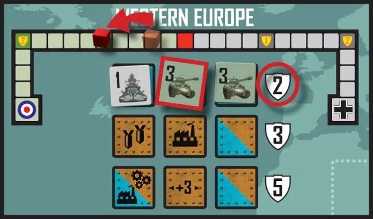 The Allied player places a 3-strength army to close this campaign. He moves the battle marker three spaces in his favor, gaining one war victory point from the victory point icon on the battle track, and gains a further two war victory points for closing this campaign.