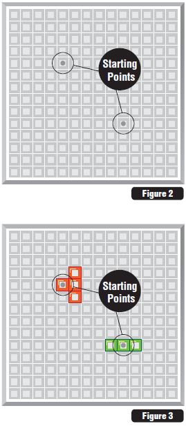 Decide who will go first. Player 1 places one of their pieces on either of the two starting points - starting points are marked with a circle. Player 2 places one of their pieces on the other starting point. (See Figures 2 and 3)