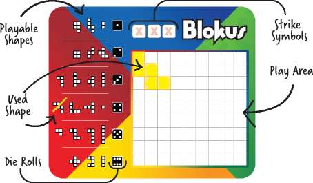The number on the chosen die corresponds to a row of Blokus shapes on the left side of your game board. Select any unused shape from that row then add it to the board's play area by coloring it in. You may rotate and flip the shape any way you want.