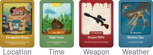 There are 4 different types of Hit Cards: Weapon, Location, Weather, Time.